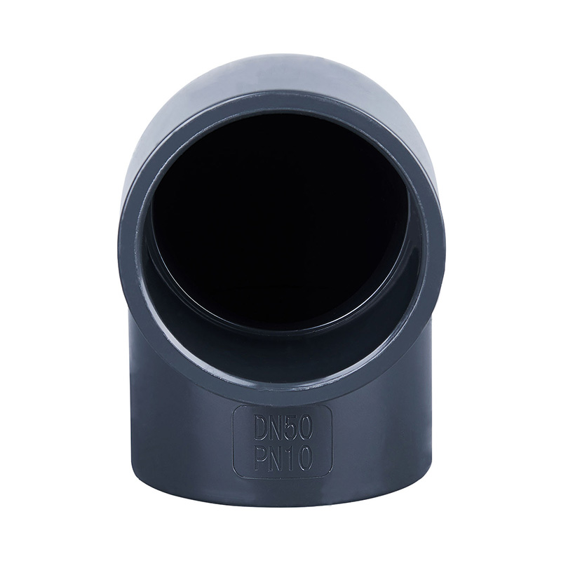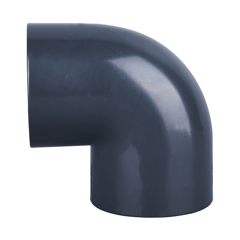 Kualitas tinggi abu-abu tua PVC-U 90° berbentuk siku DN15-DN600 1,0-1,6 MPa alat kelengkapan pipa plastik tekanan kerja untuk industri kimia dan air.