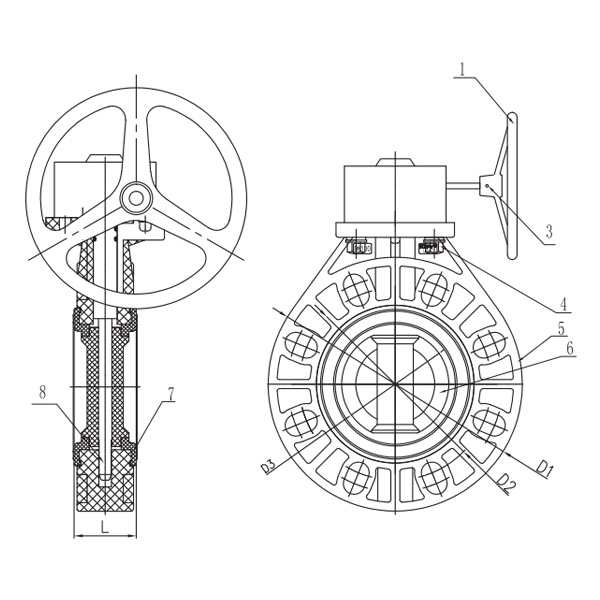 Katup Kupu-kupu Roda Gigi Cacing PVDF Segel Pusat Manual Katup Pegangan Tuas Plastik Industri dan Rumah Tangga Segel Lembut DN32-1000